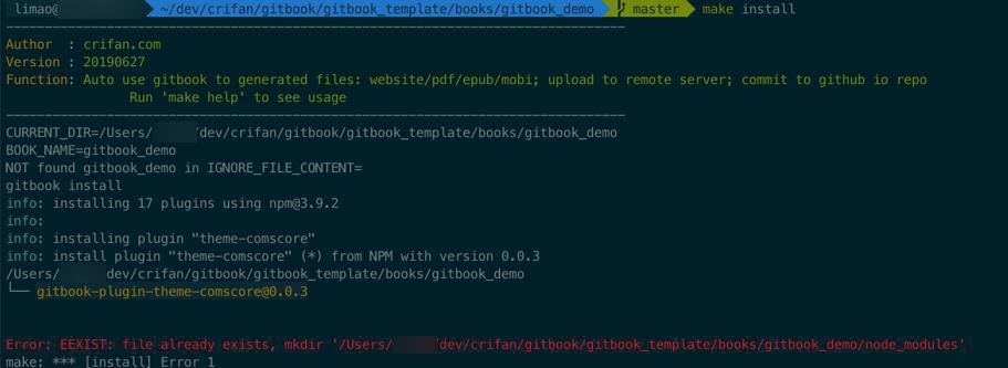 master make install -------------------------------------------------------------------------------- Author : crifan.com Version : 20190627 Function: Auto use gitbook to generated files: website/pdf/epub/mobi; upload to remote server; commit to github io repo Run 'make help' to see usage -------------------------------------------------------------------------------- CURRENT_DIR=/Users/xxx/dev/crifan/gitbook/gitbook_template/books/gitbook_demo BOOK_NAME=gitbook_demo NOT found gitbook_demo in IGNORE_FILE_CONTENT= gitbook install info: installing 17 plugins using [email protected] info: info: installing plugin "theme-comscore" info: install plugin "theme-comscore" (*) from NPM with version 0.0.3 /Users/xxx/dev/crifan/gitbook/gitbook_template/books/gitbook_demo └── [email protected] Error: EEXIST: file already exists, mkdir '/Users/xxx/dev/crifan/gitbook/gitbook_template/books/gitbook_demo/node_modules' make: *** [install] Error 1