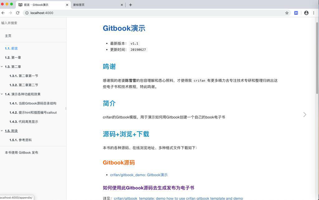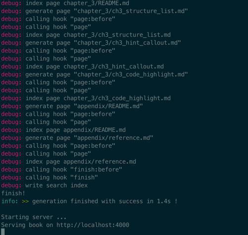 xxx@xxx ~/dev/crifan/gitbook git clone https://github.com/crifan/gitbook_template.git Cloning into 'gitbook_template'... remote: Enumerating objects: 104, done. remote: Total 104 (delta 0), reused 0 (delta 0), pack-reused 104 Receiving objects: 100% (104/104), 1.30 MiB | 638.00 KiB/s, done. Resolving deltas: 100% (28/28), done. xxx@xxx ~/dev/crifan/gitbook cd gitbook_template xxx@xxx ~/dev/crifan/gitbook/gitbook_template/books master cd gitbook_demo xxx@xxx ~/dev/crifan/gitbook/gitbook_template/books/gitbook_demo master ll total 40 -rw-r--r-- 1 xxx CORP\Domain Users 40B 3 17 09:11 Makefile -rw-r--r-- 1 xxx CORP\Domain Users 1.5K 3 17 09:11 README.md -rw-r--r-- 1 xxx CORP\Domain Users 233B 3 17 09:11 README_current.json -rw-r--r-- 1 xxx CORP\Domain Users 3.0K 3 17 09:11 book.json -rw-r--r-- 1 xxx CORP\Domain Users 456B 3 17 09:11 book_current.json lrwxr-xr-x 1 xxx CORP\Domain Users 36B 3 17 09:11 node_modules -> ../../generated/gitbook/node_modules drwxr-xr-x 9 xxx CORP\Domain Users 288B 3 17 09:11 src