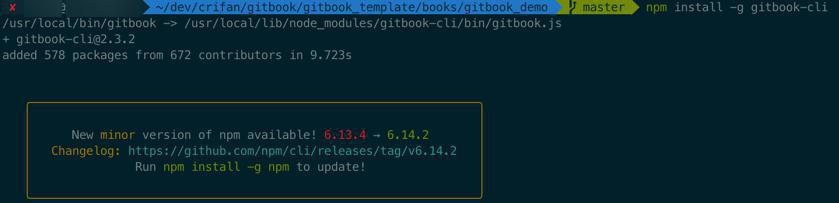 npm install -g gitbook-cli /usr/local/bin/gitbook -> /usr/local/lib/node_modules/gitbook-cli/bin/gitbook.js + [email protected] added 578 packages from 672 contributors in 9.723s ╭────────────────────────────────────────────────────────────────╮ │ │ │ New minor version of npm available! 6.13.4 → 6.14.2 │ │ Changelog: https://github.com/npm/cli/releases/tag/v6.14.2 │ │ Run npm install -g npm to update! │ │ │ ╰────────────────────────────────────────────────────────────────╯