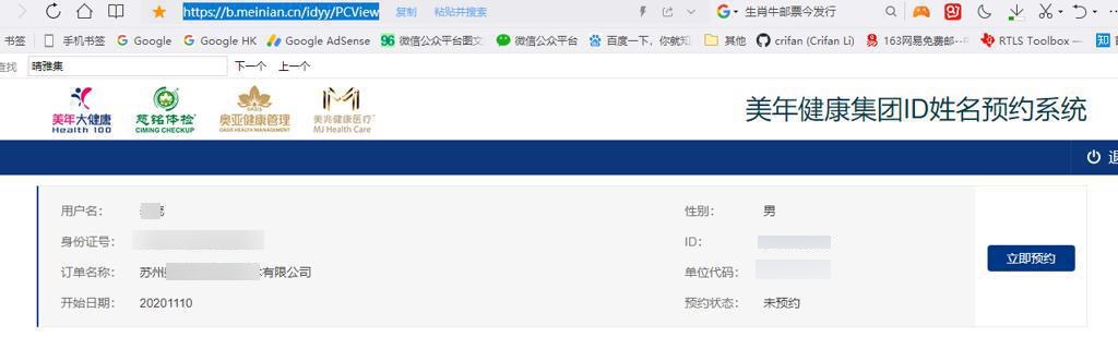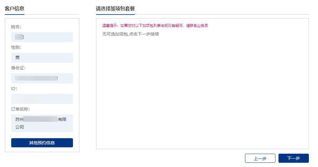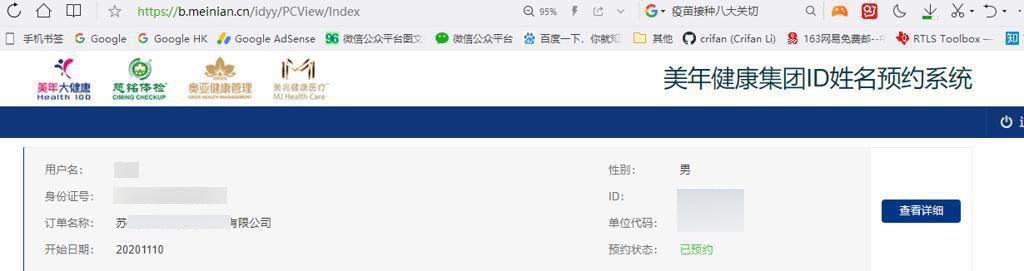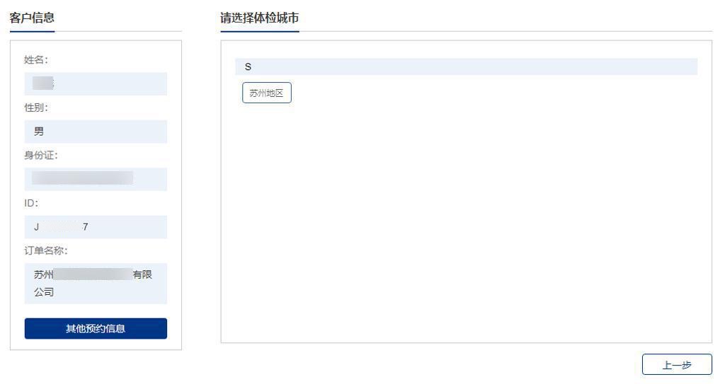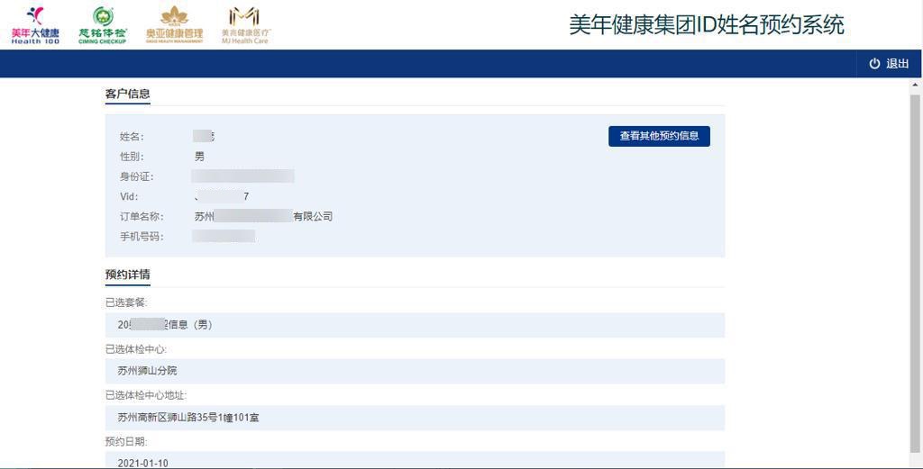 客户信息 姓名:xxx 性别:男 身份证:xxx Vid:J520309587 订单名称:苏州xxx有限公司 手机号码:xxx 预约详情 已选套餐: 20xxx信息(男) 已选体检中心: 苏州狮山分院 已选体检中心地址: 苏州高新区狮山路35号1幢101室 预约日期: 2021-01-10
