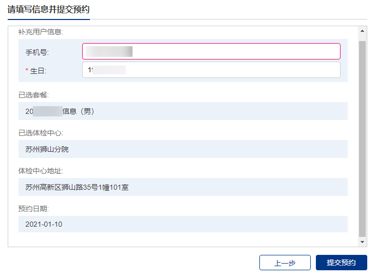 补充用户信息: 手机号: * 生日: 已选套餐: 20xxx信息(男) 已选体检中心: 苏州狮山分院 体检中心地址: 苏州高新区狮山路35号1幢101室 预约日期: 2021-01-10
