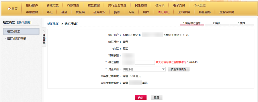 - 4. 根据您的“本年度结汇剩余额度”以及“结汇账户中对应的外币可用余额”,我们为您试算得出“最大可填写结汇金额参考”。相关金额仅供参考,具体以实际成交为准。