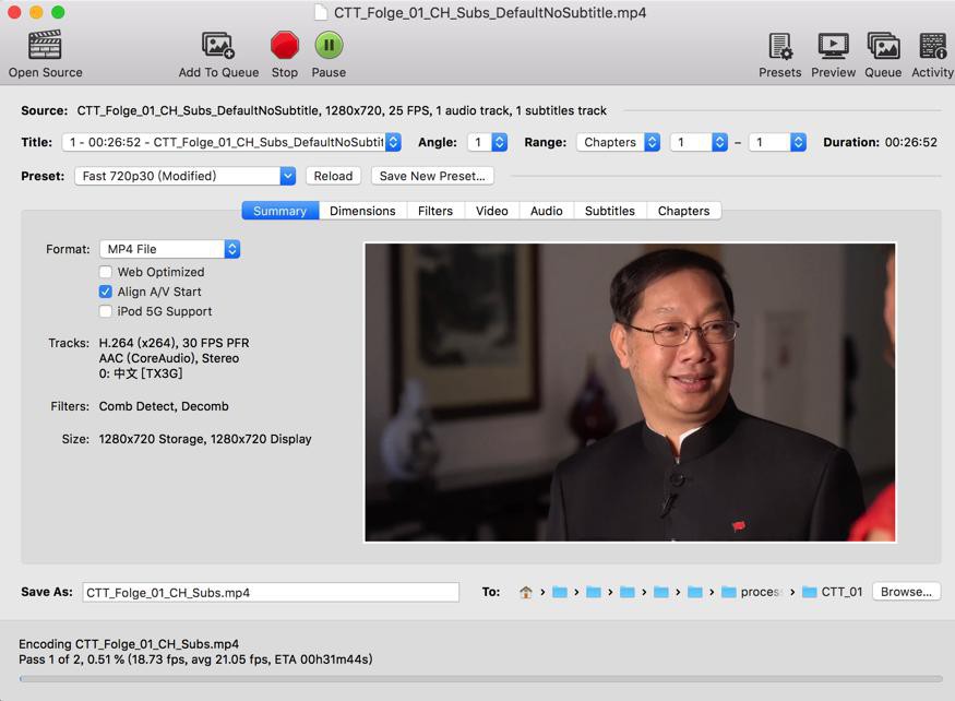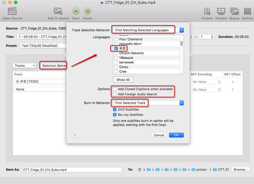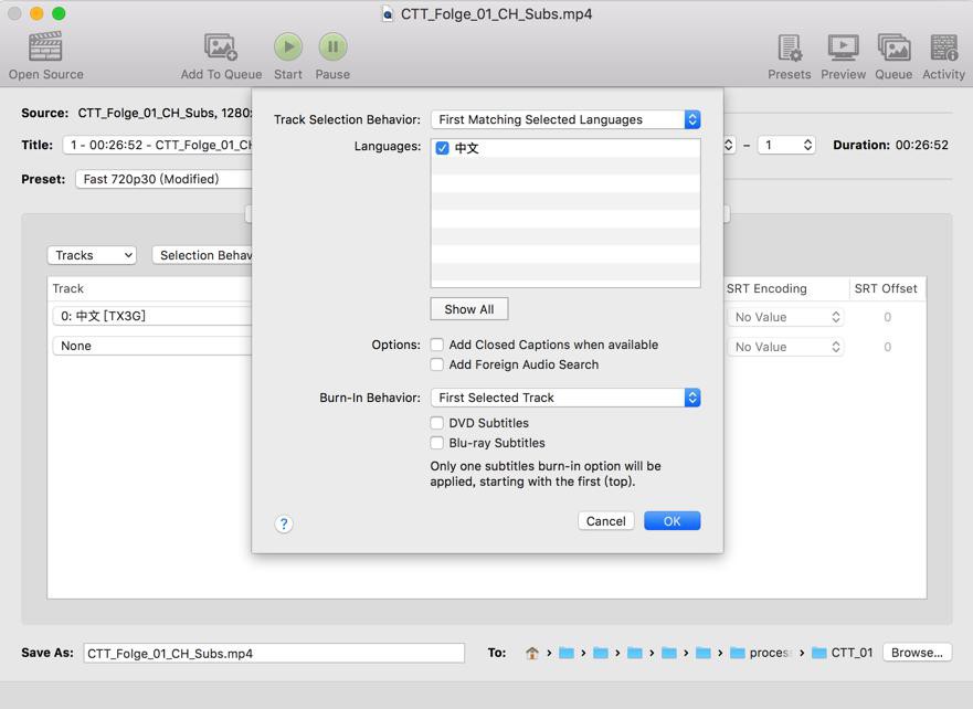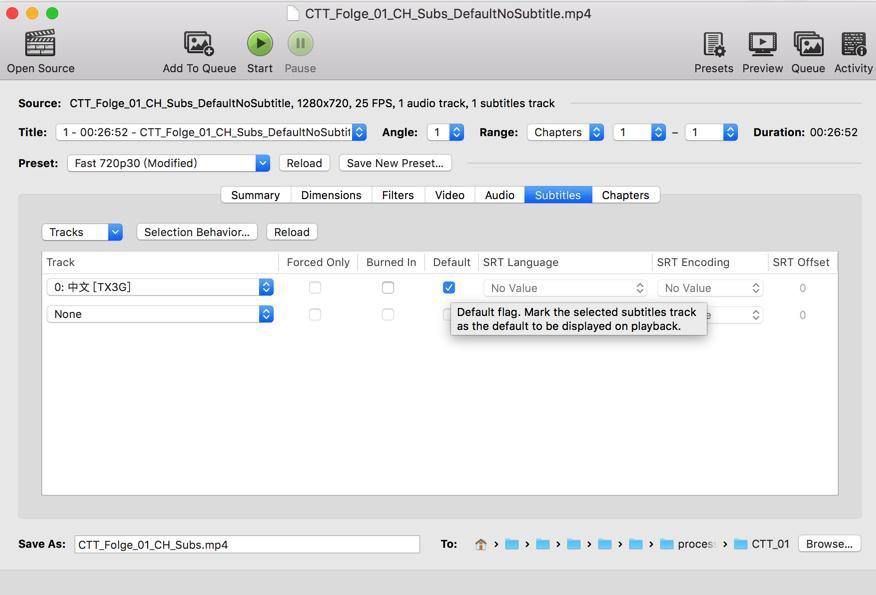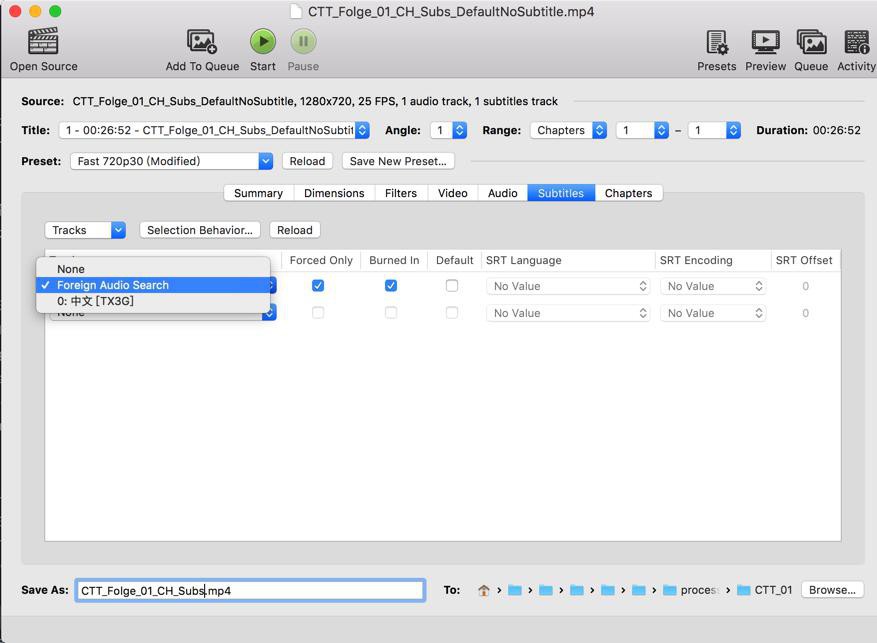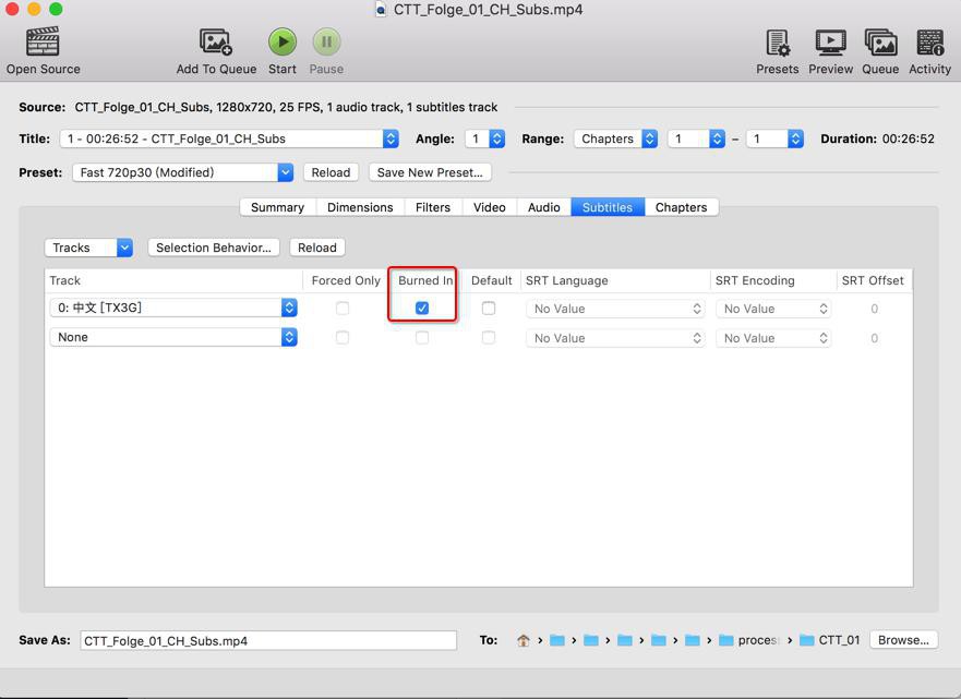 然后打算重新用Handbrake去压制,看看能否有字幕设置,默认就集成字幕的