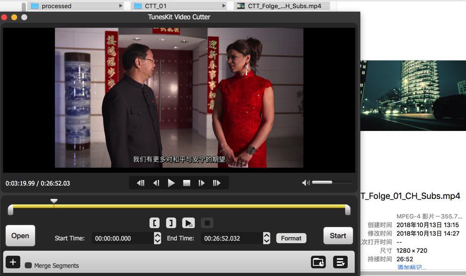 用Handbrake重新压制,字幕选择中文,且勾选Burned In,意思是把字幕内嵌在视频中,变成视频的内容的一部分了,这样压制出的mp4,用TunesKit Video Cutter预览播放,就有字幕了。