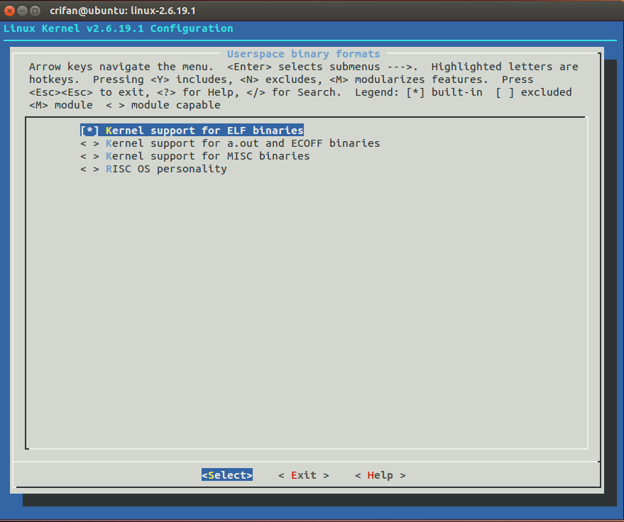 ┌──────────────────────────────── Userspace binary formats │ │ [*] Kernel support for ELF binaries │ │ │ │ < > Kernel support for a.out and ECOFF binaries │ │ │ │ < > Kernel support for MISC binaries │ │ │ │ < > RISC OS personality |