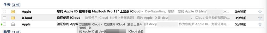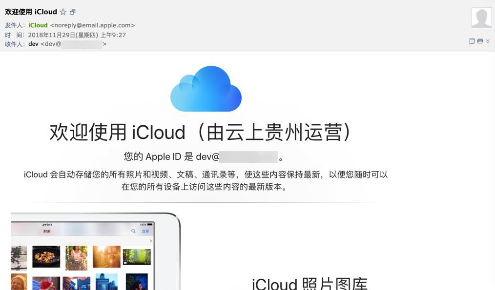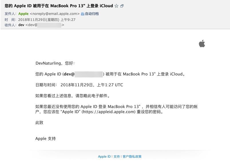 Devxxx,您好: 您的 Apple ID (dev@xxx) 被用于在 MacBook Pro 13" 上登录 iCloud。 日期与时间: 2018年11月29日,上午1:27 UTC 如果您看过上述信息,请忽略此电子邮件。 如果您最近没有使用您的 Apple ID 登录 MacBook Pro 13" ,并相信有人可能访问了您的帐户,您应该在 “Apple ID” (https://appleid.apple.com) 重设您的密码。 此致 Apple 支持