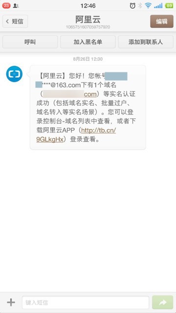 过了7天左右,收到短信通知,终于域名转入完成了: