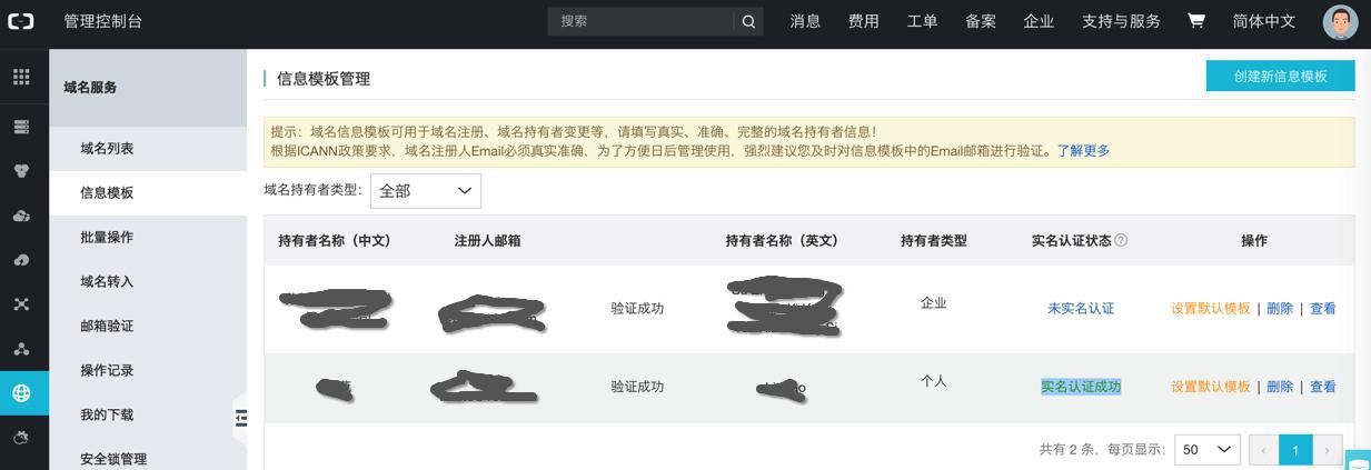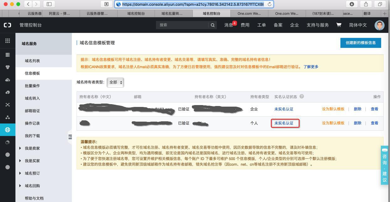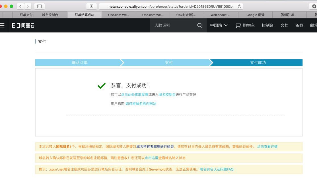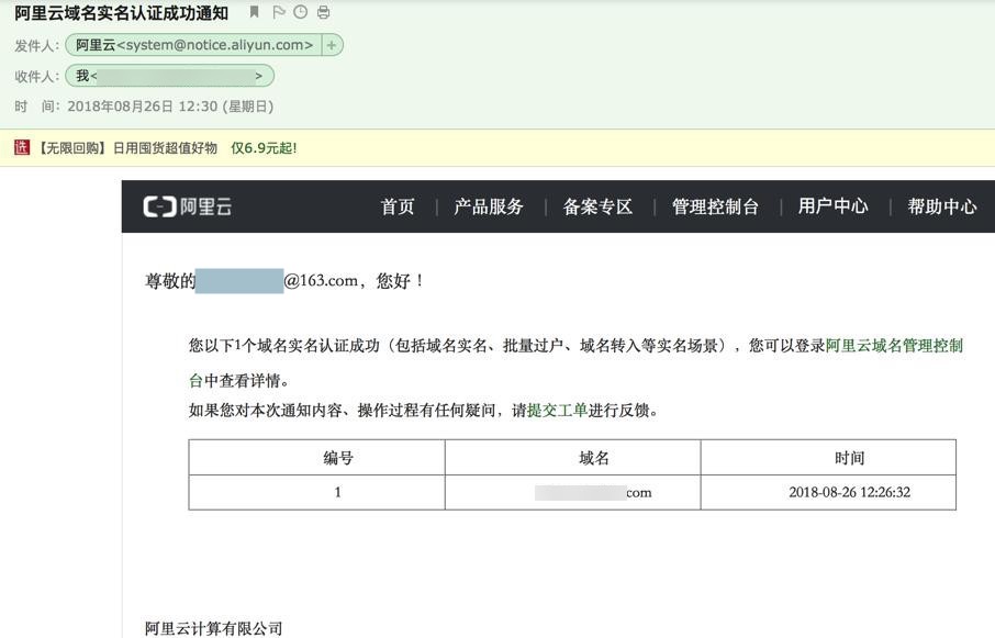 您以下1个域名实名认证成功(包括域名实名、批量过户、域名转入等实名场景),您可以登录阿里云域名管理控制台中查看详情。