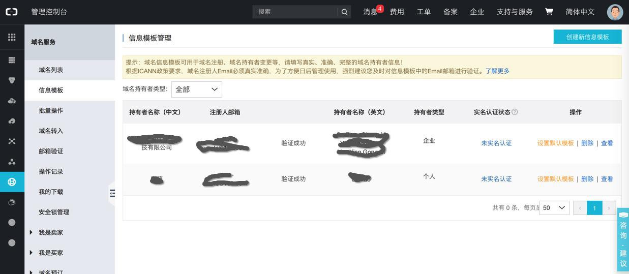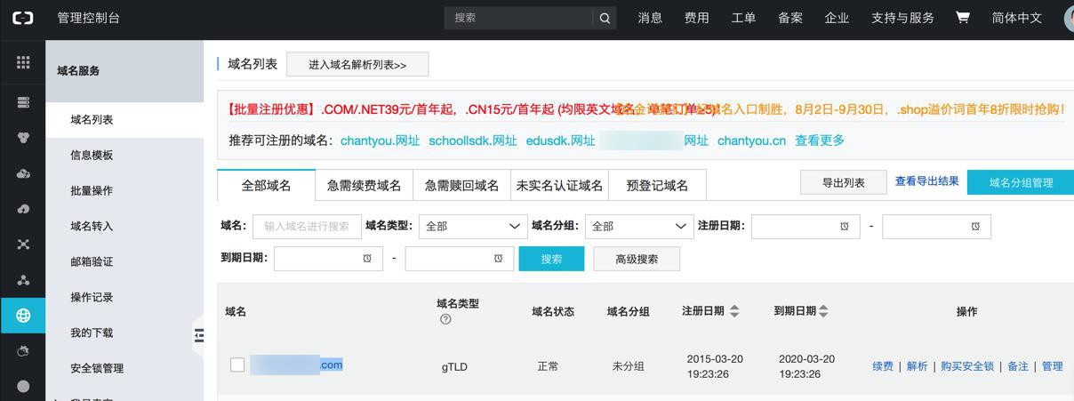 1. 核对/修改域名信息;登录万网/阿里云管理控制台>产品与服务-域名-域名列表>管理,进行信息核对或修改
