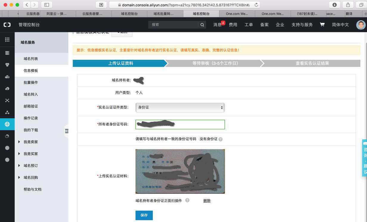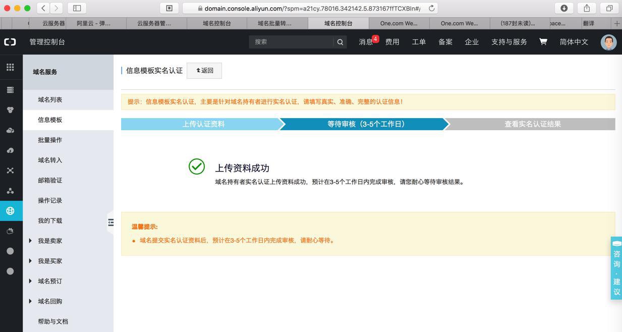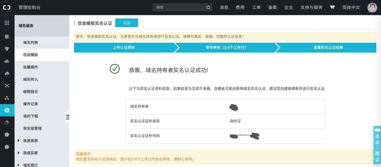 上传资料成功 域名持有者实名认证上传资料成功,预计在3-5个工作日内完成审核,请您耐心等待审核结果。 温馨提示: * 域名提交实名认证资料后,预计在3-5个工作日内完成审核,请耐心等待。