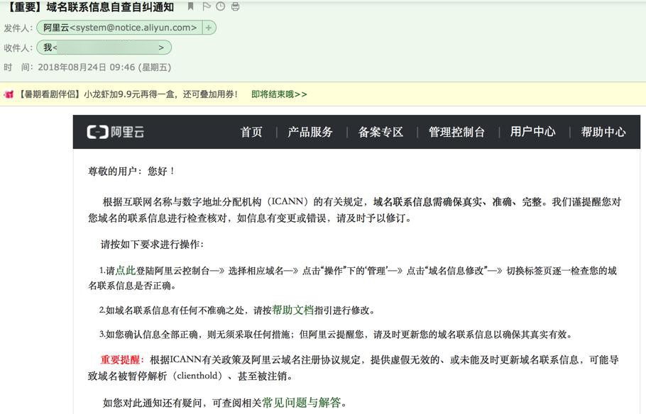 尊敬的用户:您好! 根据互联网名称与数字地址分配机构(ICANN)的有关规定,域名联系信息需确保真实、准确、完整。我们谨提醒您对您域名的联系信息进行检查核对,如信息有变更或错误,请及时予以修订。 请按如下要求进行操作: 1.请点此登陆阿里云控制台—》选择相应域名—》点击“操作”下的‘管理’—》点击“域名信息修改”—》切换标签页逐一检查您的域名联系信息是否正确。 2.如域名联系信息有任何不准确之处,请按帮助文档指引进行修改。 3.如您确认信息全部正确,则无须采取任何措施;但阿里云提醒您,请及时更新您的域名联系信息以确保其真实有效。 重要提醒:根据ICANN有关政策及阿里云域名注册协议规定,提供虚假无效的、或未能及时更新域名联系信息,可能导致域名被暂停解析(clienthold)、甚至被注销。 如您对此通知还有疑问,可查阅相关常见问题与解答。