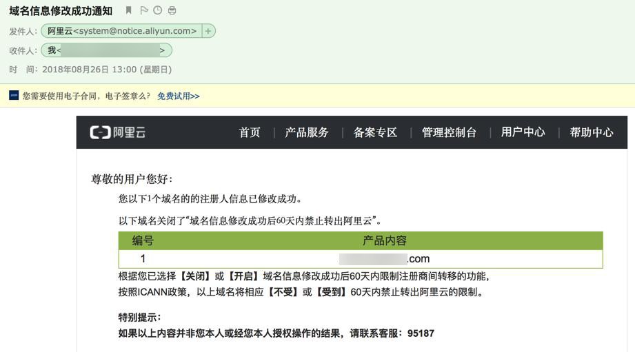 尊敬的用户您好: 您以下1个域名的的注册人信息已修改成功。 以下域名关闭了“域名信息修改成功后60天内禁止转出阿里云”。 编号 产品内容 1 xxx.com 根据您已选择【关闭】或【开启】域名信息修改成功后60天内限制注册商间转移的功能, 按照ICANN政策,以上域名将相应【不受】或【受到】60天内禁止转出阿里云的限制。 特别提示: 如果以上内容并非您本人或经您本人授权操作的结果,请联系客服:95187