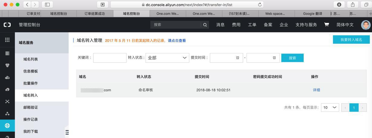 接着去把域名转入阿里云