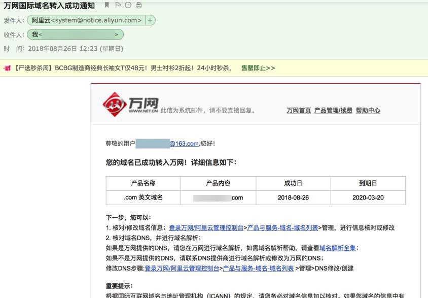您的域名已成功转入万网!详细信息如下: