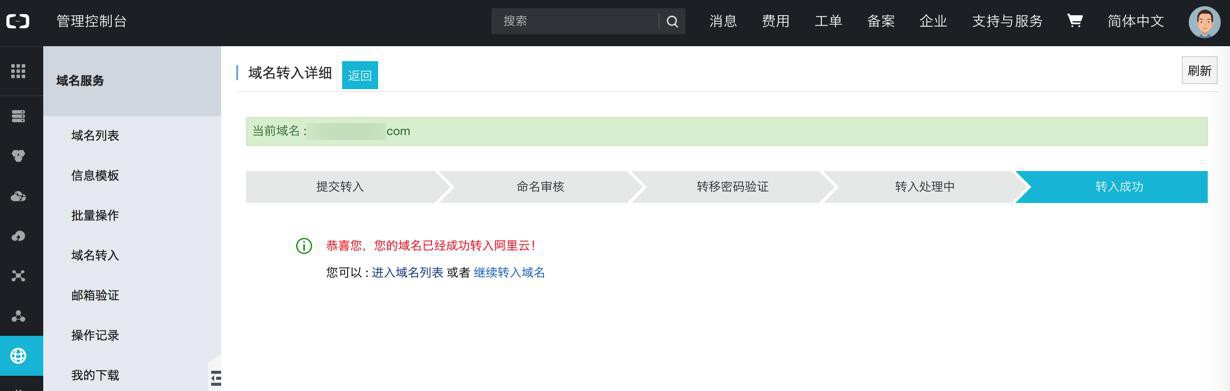 提交转入 命名审核 转移密码验证 转入处理中 转入成功 恭喜您,您的域名已经成功转入阿里云! 您可以 :进入域名列表或者继续转入域名