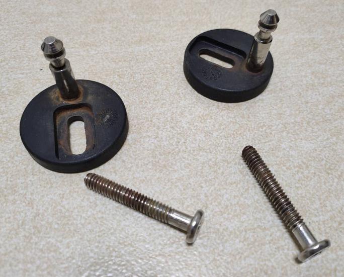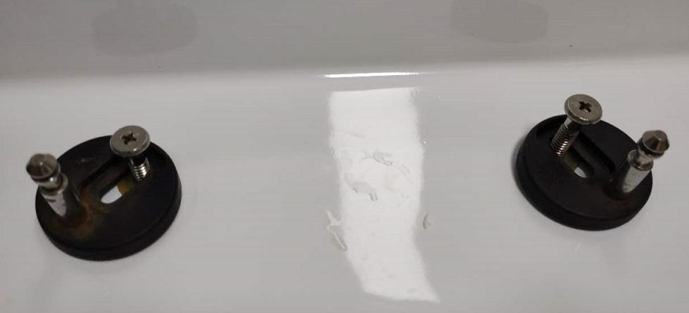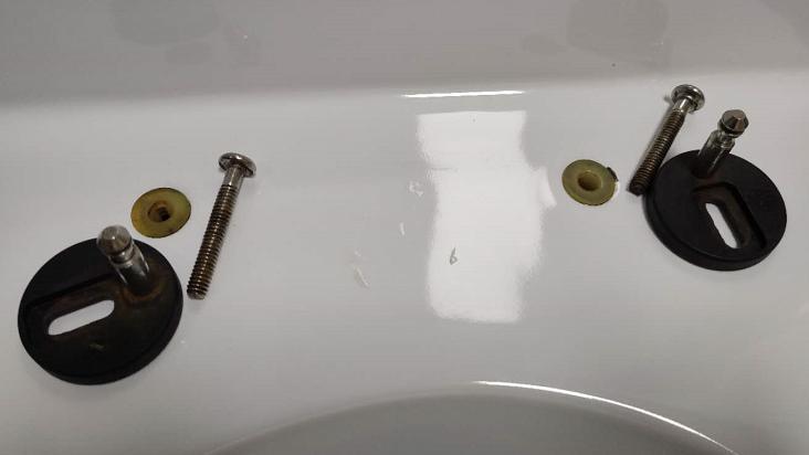 此时再去调整好底部2个圆片的位置,把马桶盖子对准突出的螺丝,盖上去