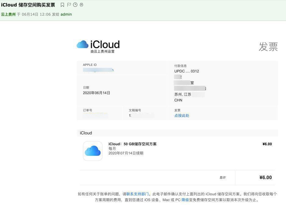 iCloud 发票 APPLE ID 付款信息 CHN 日期 2020年06月14日 订单号 xx 文稿编号 xx 发票 点按此处 iCloud iCloud:50 GB储存空间方案 每月 2020年07月14日续期 ¥6.00 总计 ¥6.00 如有任何关于账单的问题,请联系支持部门。此电子邮件确认支付上面列出的 iCloud 储存空间方案。我们将向您收取每个方案周期的费用,直到您通过 iOS 设备、Mac 或 PC 降级至免费储存空间方案以取消本次升级为止。 在中国大陆,iCloud 由云上贵州大数据产业发展有限公司(云上贵州)运营。如需获得 iCloud(由云上贵州运营)退款,请在升级后 15 天内联系支持部门。