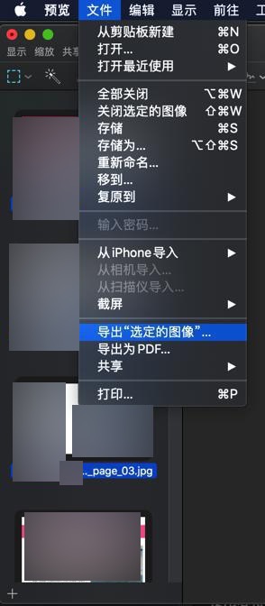 导出转换后的结果:确保Command+A全选缩略图中所有图片后 -》 文件-》文件 -》 导出“选定的图像”