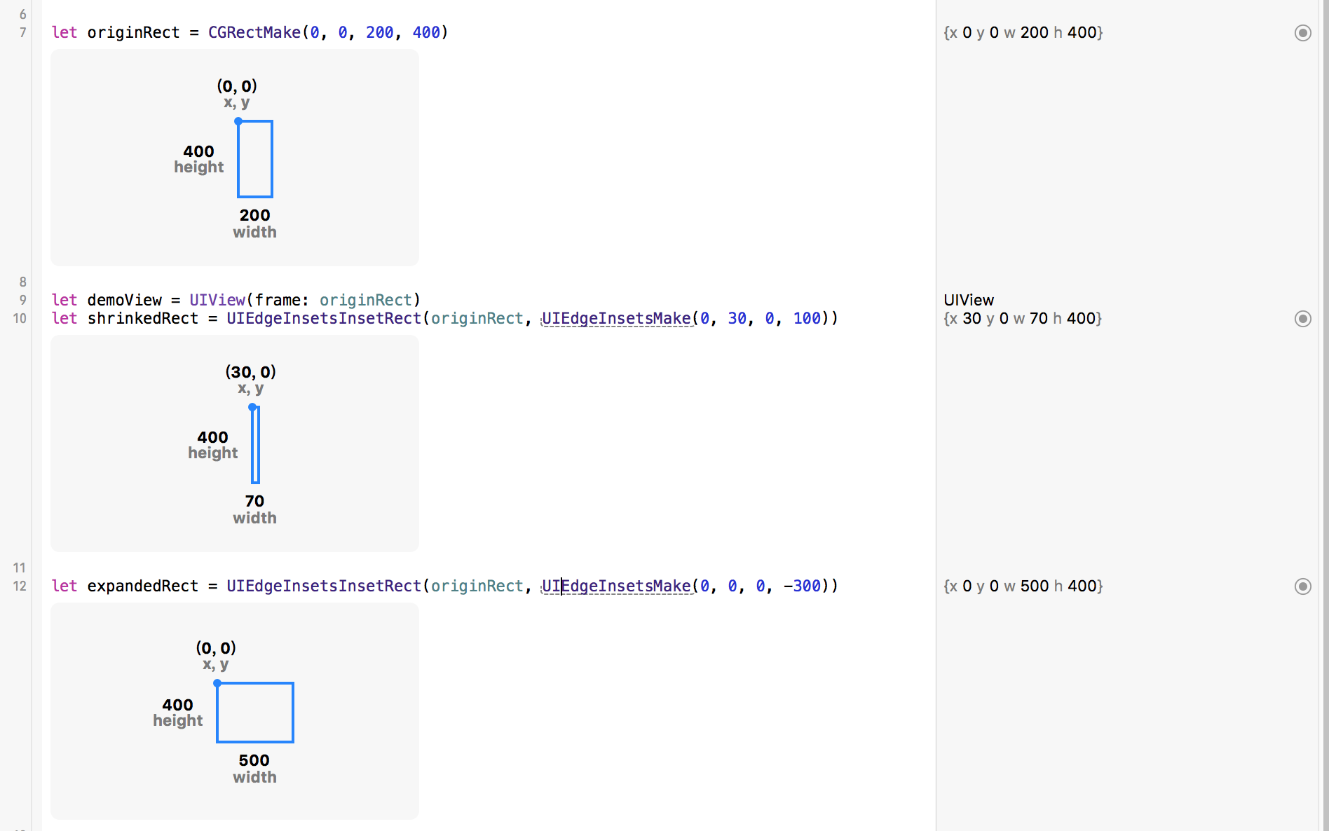 let originRect = CGRectMake(0, 0, 200, 400) let demoView = UIView(frame: originRect) let shrinkedRect = UIEdgeInsetsInsetRect(originRect, UIEdgeInsetsMake(0, 30, 0, 100)) let expandedRect = UIEdgeInsetsInsetRect(originRect, UIEdgeInsetsMake(0, 0, 0, -300))
