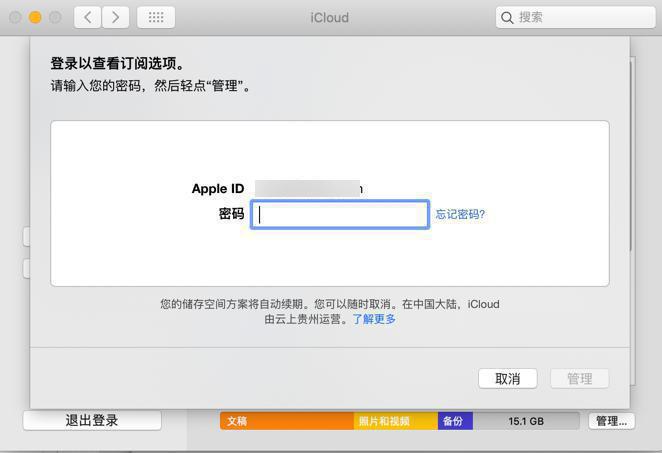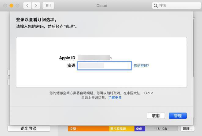 6. 输入您的 Apple ID 密码,然后点按“管理”。