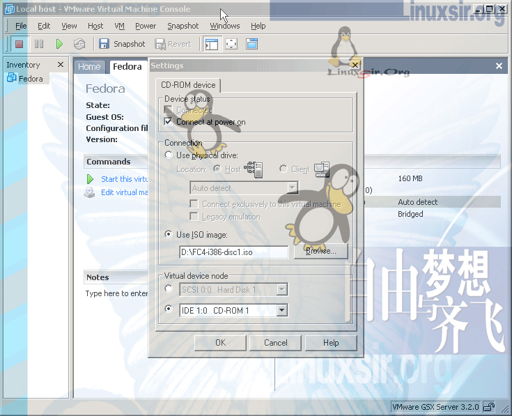 查看CD-ROM :VMware 有虚拟光驱的能力,我们可以在[Use ISO image]把Fedora Core 4.0的第一个ISO指定进来,这样我们Start Fedora 虚拟机时,就能进入Fedora Core 4.0 的安装界面;