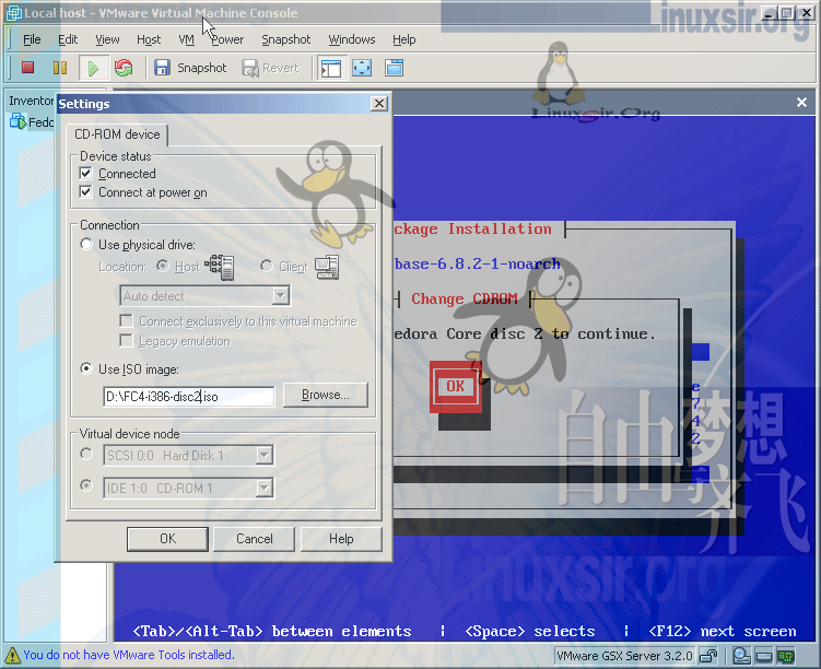 特别提示:中间换盘时,点CD-ROM :在[Use ISO image]把Fedora Core 4.0的第二个ISO指定进来;然后就能接着安装了;以此类推,第三张和第四张盘;