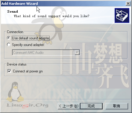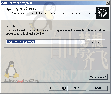 下一步如图,按完成就是了;如果在机器启动的过程中出现什么Redhat Linux.vmdk 什么错误之类的,按他的提示移除;我们能用mount读写这个分区就行了;