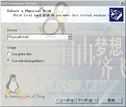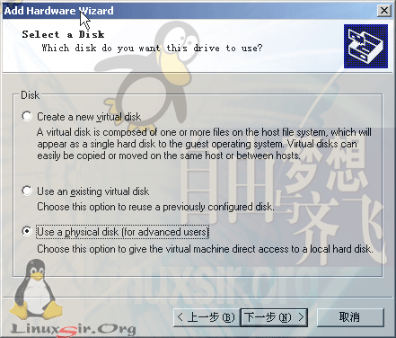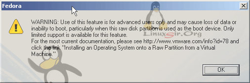 这是添加物理磁盘的警告 :要小心操作:如果您只是想再为FC4添加一个虚拟分区的话,还是虚拟的好;点上面图的第一项就行;
