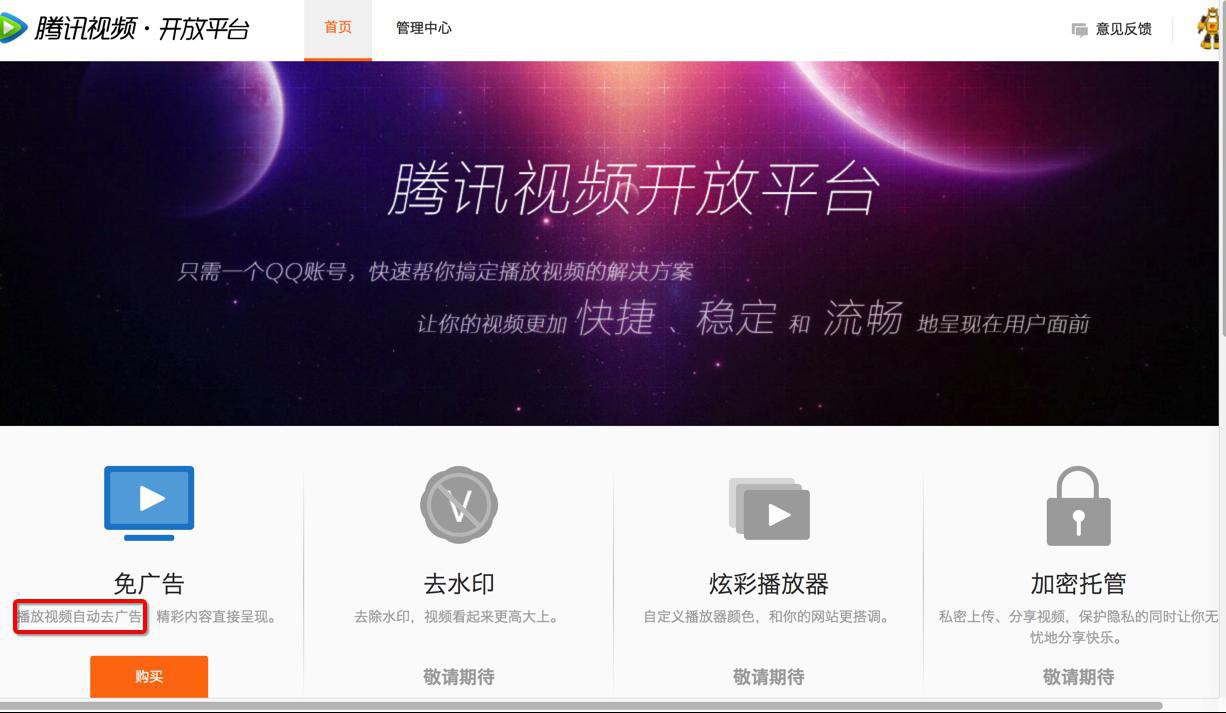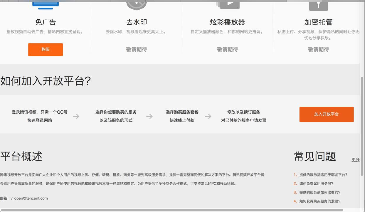 腾讯视频开放平台是面向广大企业和个人用户的视频上传、存储、转码、播放、商务等一些列高级服务需求,提供一套完整而简便的解决方案的平台。腾讯视频开放平台将会给用户提供高质量的服务,确保用户所使用的视频能和腾讯视频本身一样流畅和稳定。为用户提供了多种商务合作模式,可支持常见的PC和移动终端。”