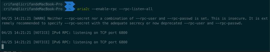 crifan@licrifandeMacBook-Pro ~ aria2c --enable-rpc --rpc-listen-all 04/25 14:21:21 [WARN] Neither --rpc-secret nor a combination of --rpc-user and --rpc-passwd is set. This is insecure. It is extremely recommended to specify --rpc-secret with the adequate secrecy or now deprecated --rpc-user and --rpc-passwd. 04/25 14:21:21 [NOTICE] IPv4 RPC: listening on TCP port 6800 04/25 14:21:21 [NOTICE] IPv6 RPC: listening on TCP port 6800