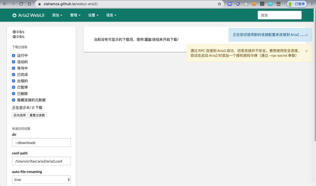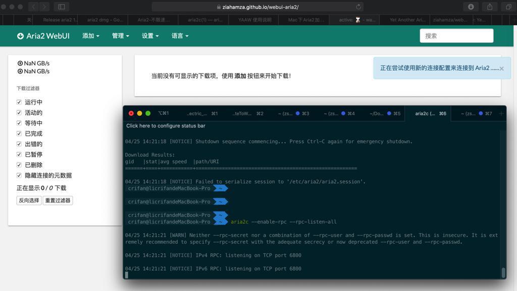 ✘ crifan@licrifandeMacBook-Pro ~ aria2c 04/25 14:16:29 [WARN] Neither --rpc-secret nor a combination of --rpc-user and --rpc-passwd is set. This is insecure. It is extremely recommended to specify --rpc-secret with the adequate secrecy or now deprecated --rpc-user and --rpc-passwd. 04/25 14:16:29 [NOTICE] IPv4 RPC: listening on TCP port 6800 04/25 14:16:29 [NOTICE] IPv6 RPC: listening on TCP port 6800