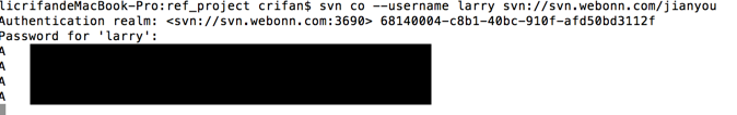 licrifandeMacBook-Pro:ref_project crifan$ svn co –username xxx svn://svn.webonn.com/jianyou Authentication realm: <svn://svn.webonn.com:3690> 68140004-c8b1-40bc-910f-afd50bd3112f Password for ‘xxx’: |