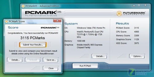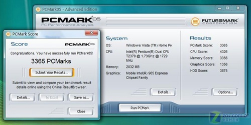 当然,Windows体验索引也并不是一款专业的测试软件,一些细微的差距可能会被忽略掉。下面我们就通过更为权威的系统综合效能测试软件PCmark05对其进行测试。