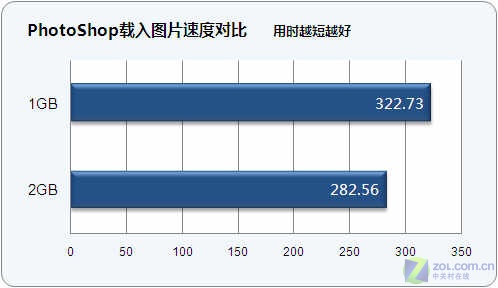 测试结果表明,当内存容量扩充至2GB后,载入这些图片的用时缩短了大约12%,效能提升还是比较明显的。这意味着在运行一些对内存要求较高的大型应用程序时,较大的内存容量还是有一定优势的。
