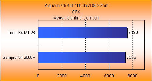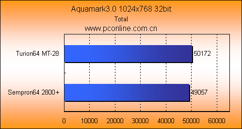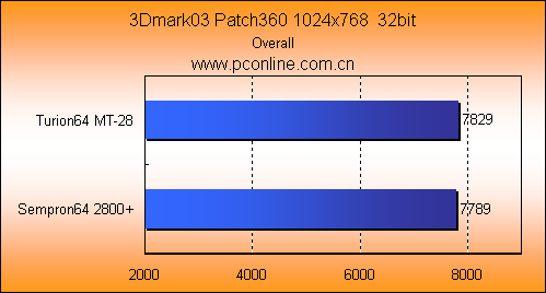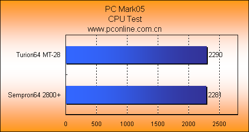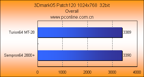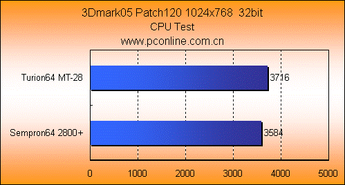 3Dmrk03和05的图形测试中,Turion64 MT-28与Sempron64 2800+的成绩相近,Turion64 MT-28只能在CPU性能测试上取得三个百分点的领先。