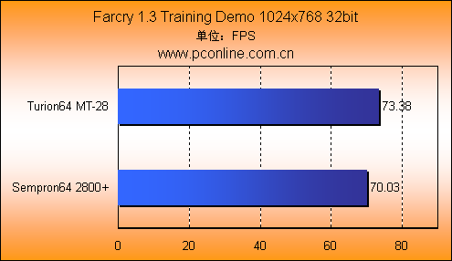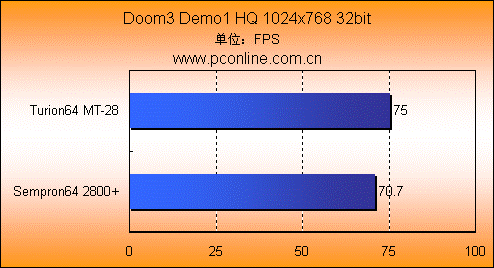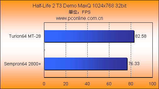虽然在3D理论测试中,Turion64 MT-28与Sempron64 2800+的差距很小,但是到了真实3D游戏测试,它们之间的差距就开始拉大。这是因为真实的游戏中会涉及到大量的AI和物理引擎运算,而这些运算的命中率很大程度上是受处理器二级缓存的影响。