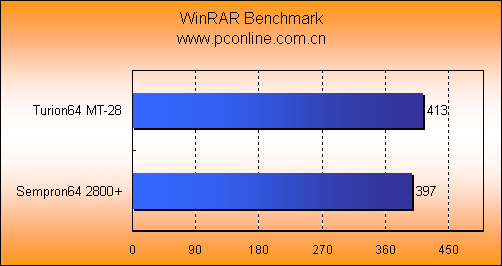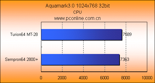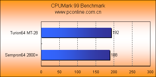 在纯数学运算测试的CPUMark 99中,Turion64 MT-28继续发挥二级缓存上的优势。