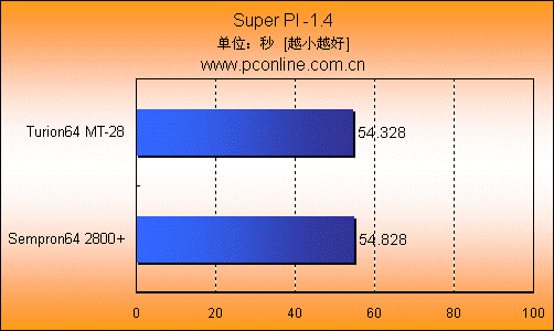 100万位的圆周率计算中,Turion64 MT-28以0.5秒的优势压过Sempron64 2800+。