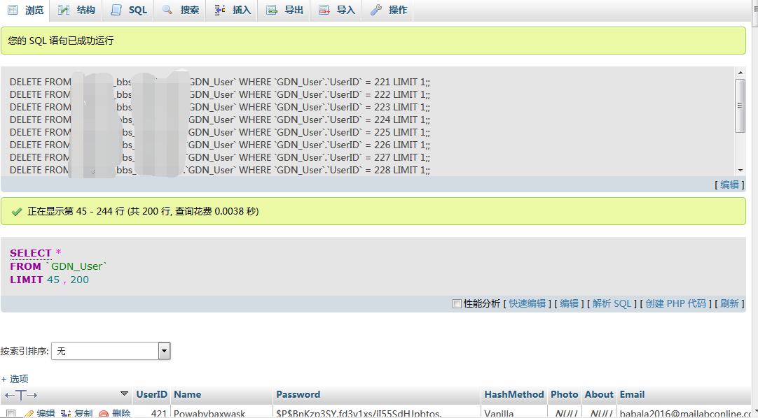 所以得抽空想办法去,登录到数据库后台,删除掉bbs里面的垃圾用户,一次性解决问题。