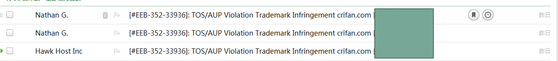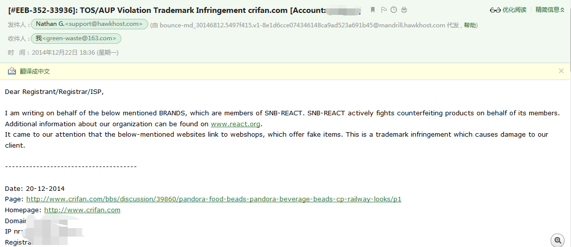 crifan.com下面的bbs,里面由于疏于管理而被(估计是机器人)注册用户发了垃圾帖子,从而导致商标侵权,而导致被投诉,网站被hawk停掉了。
