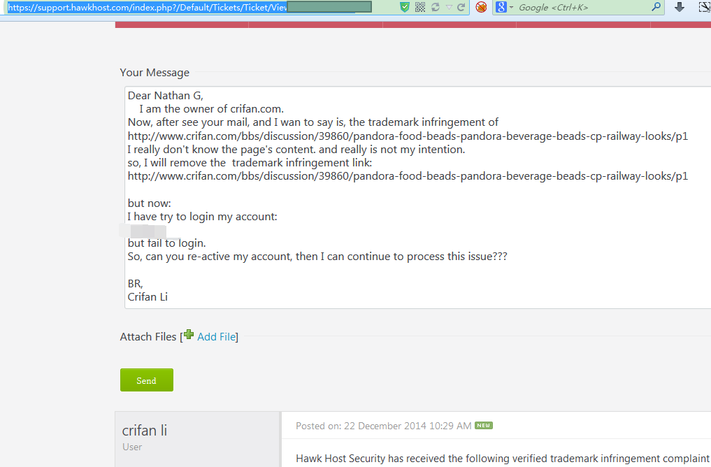 3.然后后来去找到了hawkhost里面的ticket系统找到了对应的邮件,然后去回复: