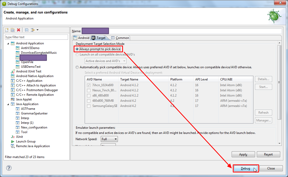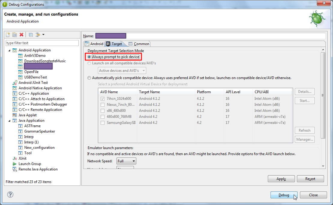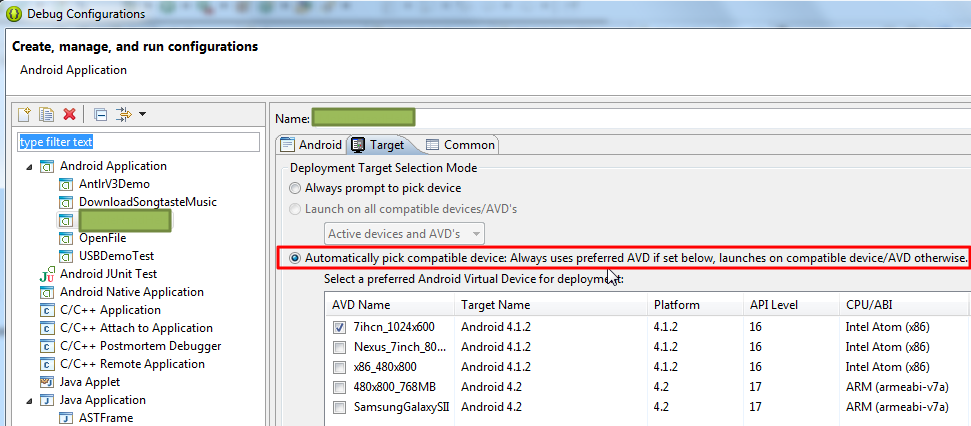 Automatically pick compatible device: Always uses preferred AVD if set below, launches on compatible device/AVD otherwise