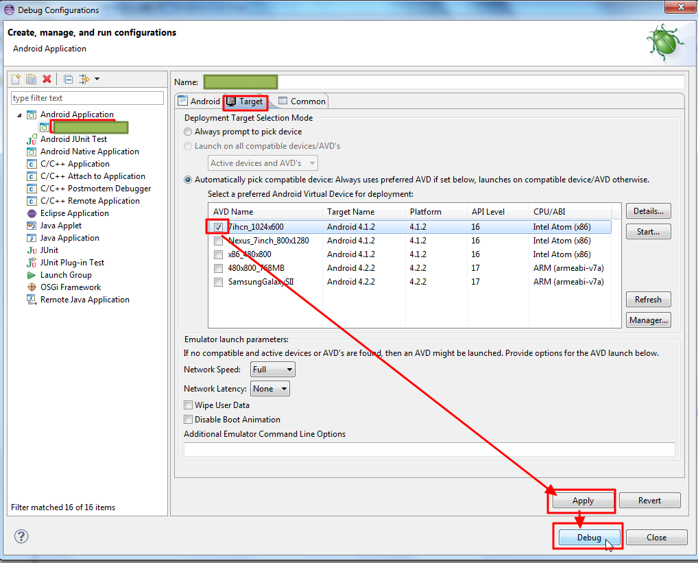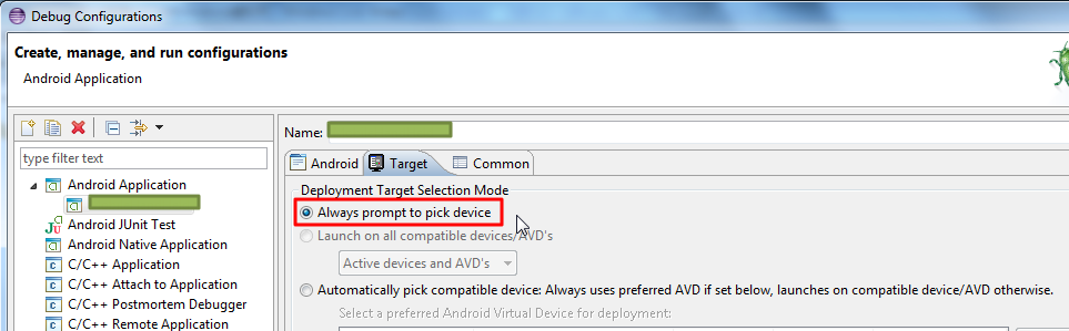 默认对于debug的配置,选择了自动选择还是的AVD,但是结果却没有选择任何AVD