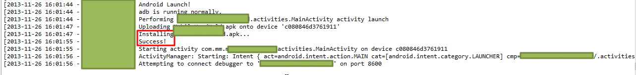[2013-11-26 16:01:55 - xxxxxx] Starting activity com.yyy.xxxxxx.activities.MainActivity on device c080846d3761911