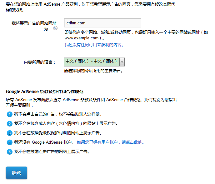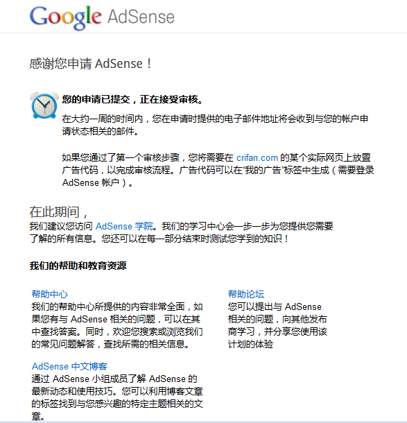 | 感谢您申请 AdSense! 您的申请已提交,正在接受审核。 在大约一周的时间内,您在申请时提供的电子邮件地址将会收到与您的帐户申请状态相关的邮件。 如果您通过了第一个审核步骤,您将需要在 crifan.com 的某个实际网页上放置广告代码,以完成审核流程。广告代码可以在“我的广告”标签中生成(需要登录 AdSense 帐户)。 |