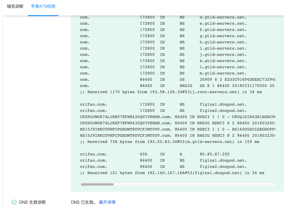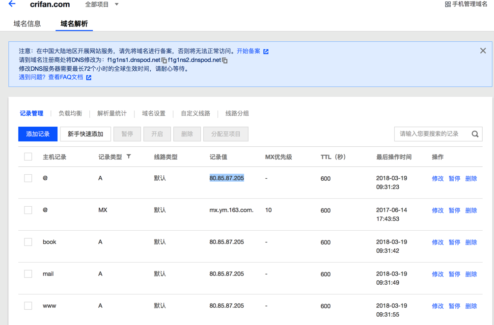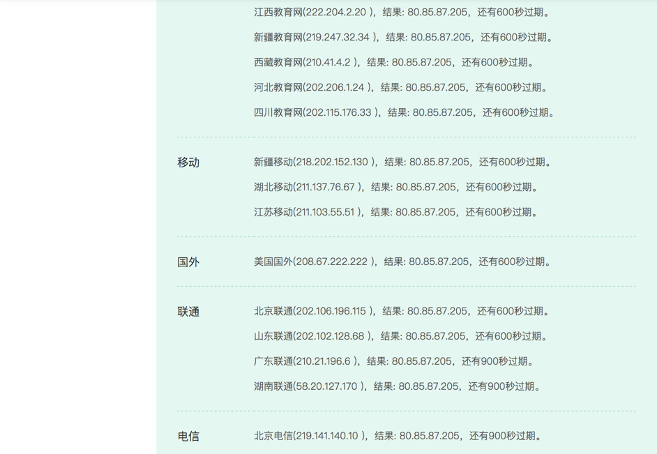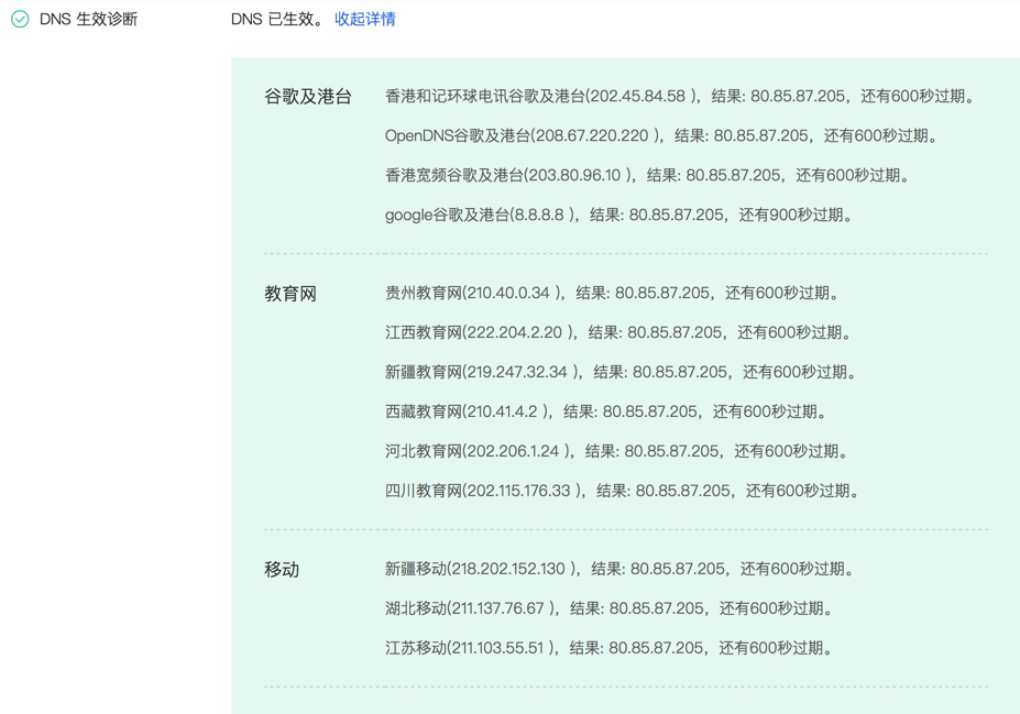 此处好像只有几分钟,还没到10分钟,结果DNS解析域名都已经生效了,都已经是新的IP:80.85.87.205 了。效率挺高啊。