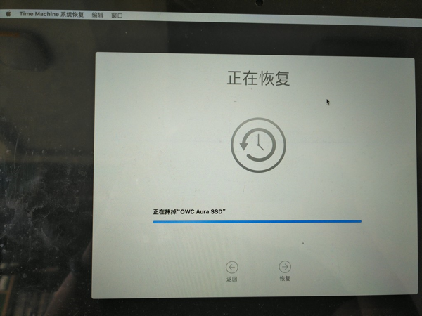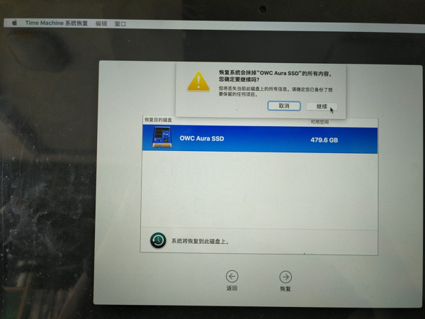 恢复系统会抹掉“OWC Aura SSD”的所有内容。您确定要继续吗?