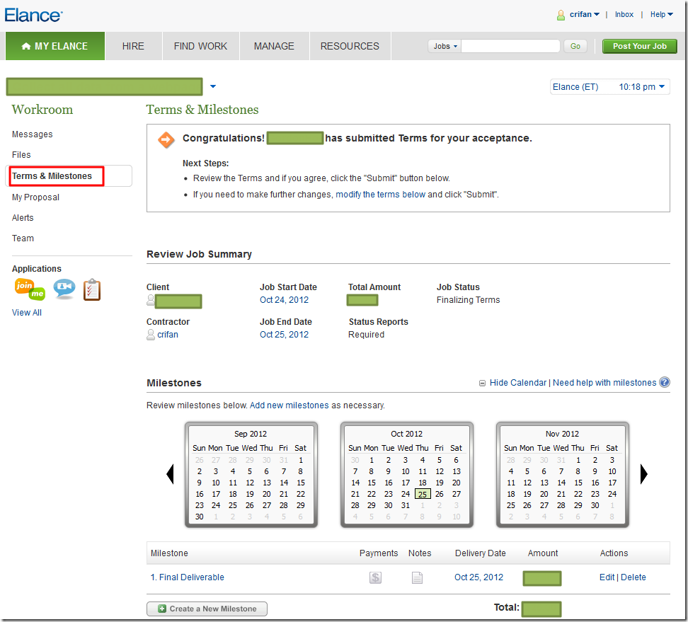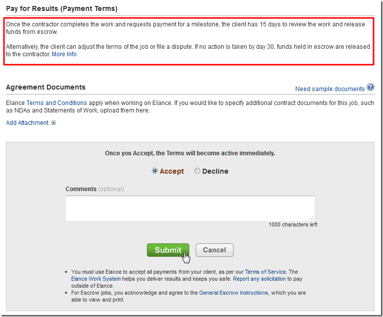 (在设置好了Milestone后,干活的你,contractor,在完成任务后,client,雇主,有15天检查任务结果的时间,检查OK了,就可以从Elance系统escrow中放款给你了;