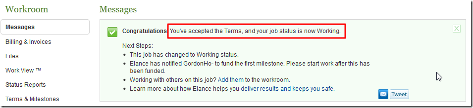 不过上述显示的意思是,Elance系统会通知雇主,针对第一个milestone打款(给Elance系统),然后你得知(估计系统会通知你)雇主打款给系统了,然后你就可以去干活了。