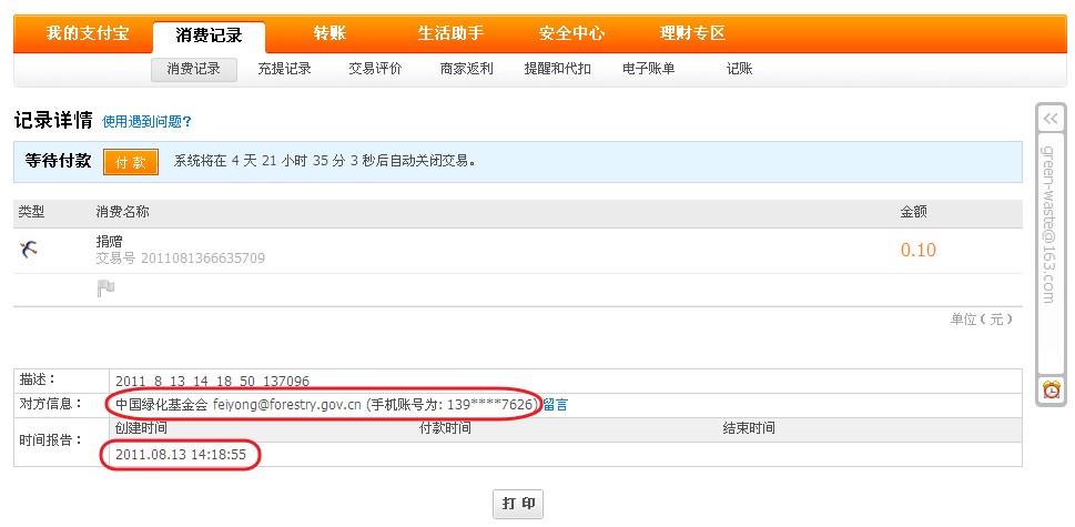 今天登陆支付宝,发现又遇到一个类似的记录,也是在我个人不知情的情况下,多出个“中国绿化基金会”扣我0.10元,幸好是还是没有余额,然后没有成功,截图如下: